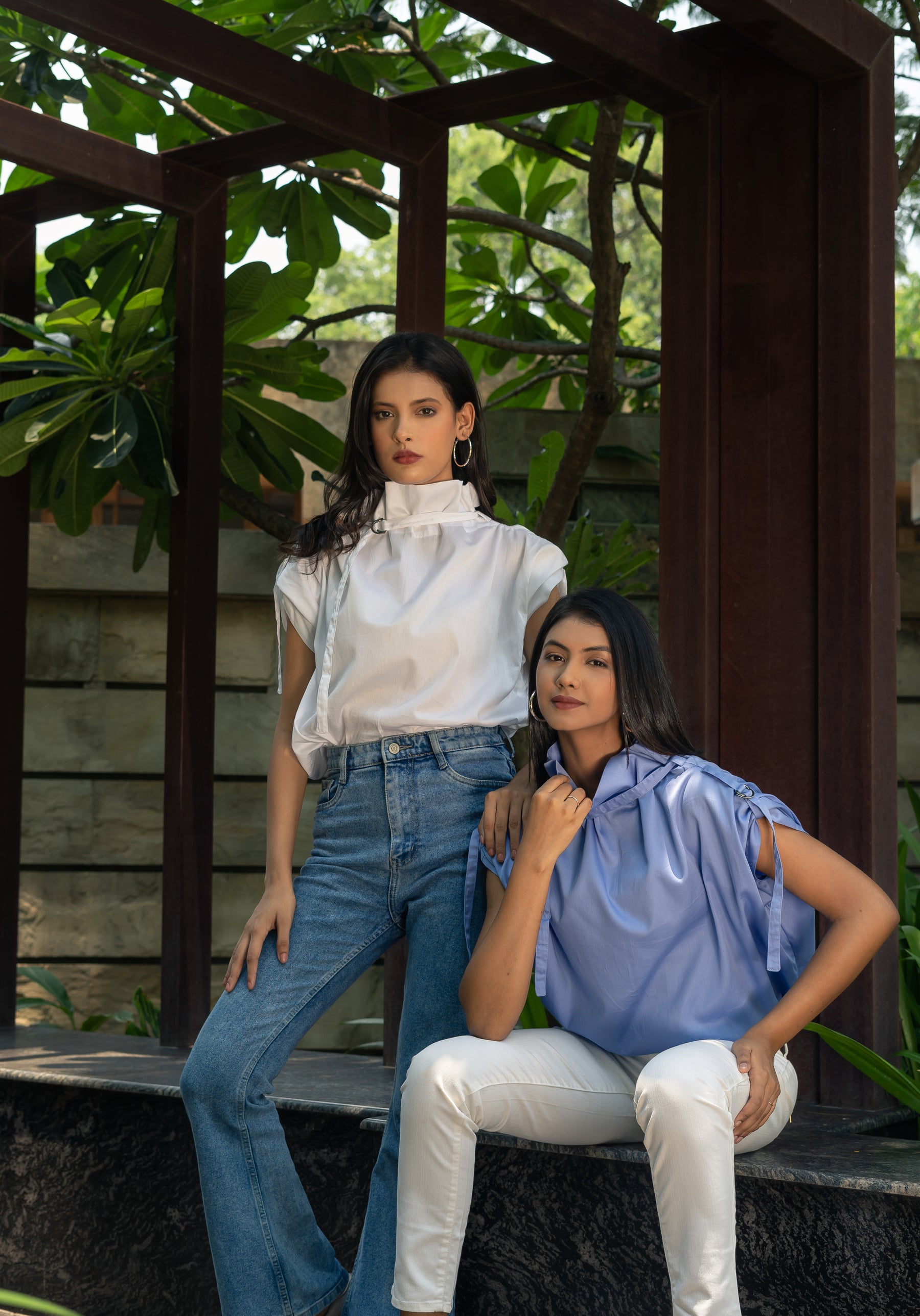 Elevate your wardrobe with this chic top, featuring a high ruffled neckline and a delicate tie detail. Crafted from soft, high-quality fabric, it offers a flattering drape and an effortlessly polished look. The refined silhouette transitions seamlessly from day to night—perfect for pairing with tailored trousers, denim, or skirts. Whether styled casually or dressed up, this piece is a versatile essential for any wardrobe.