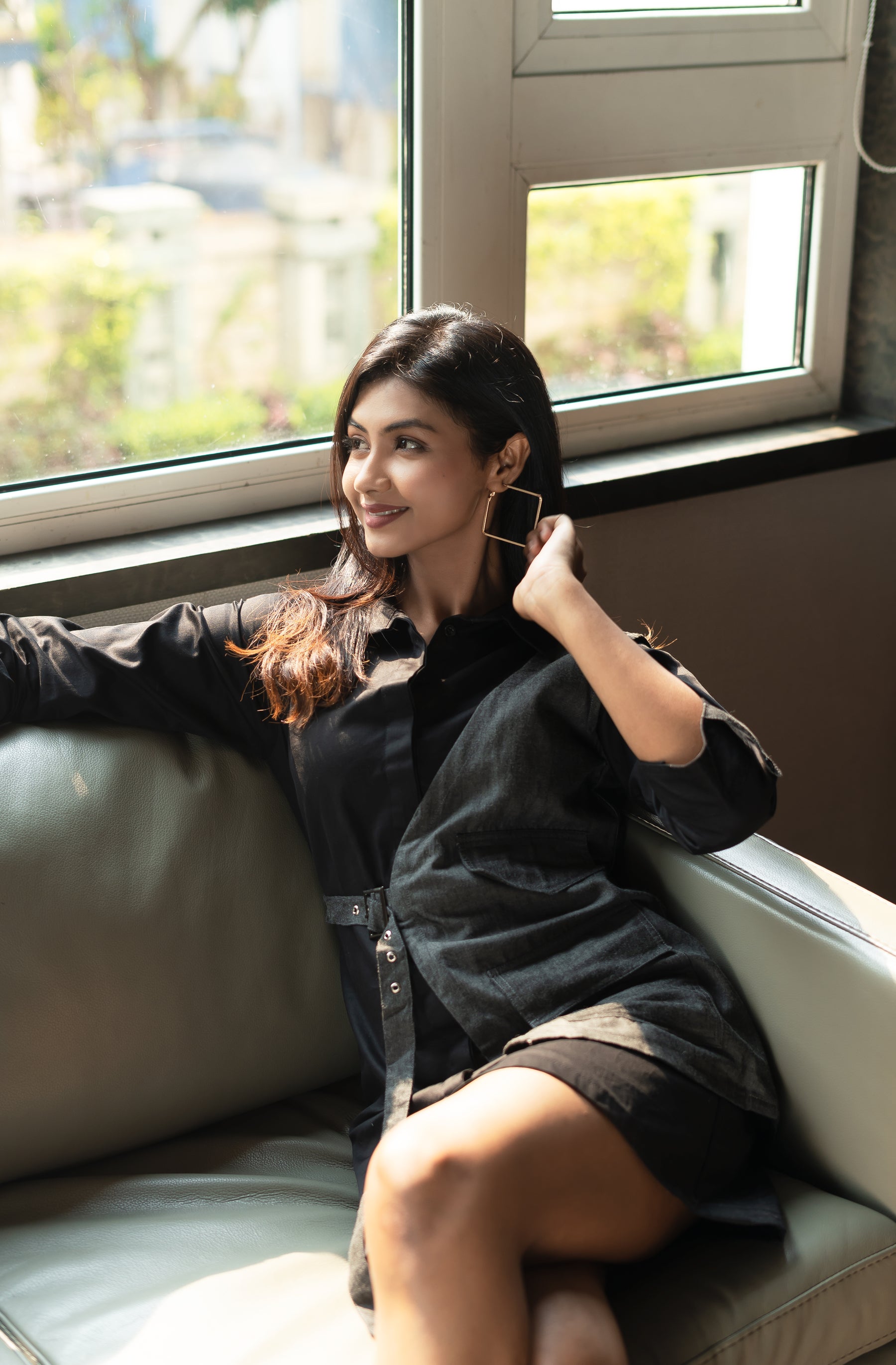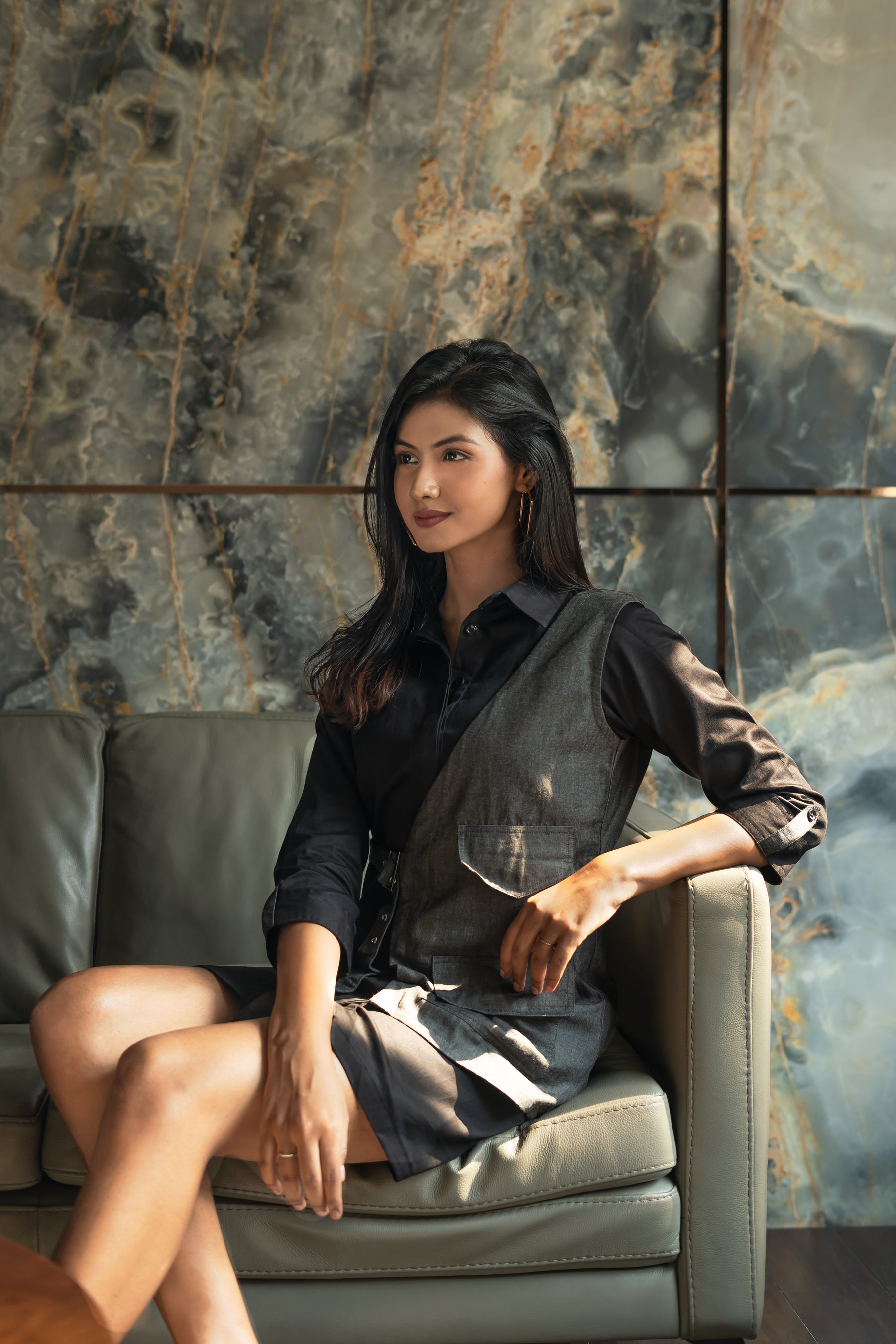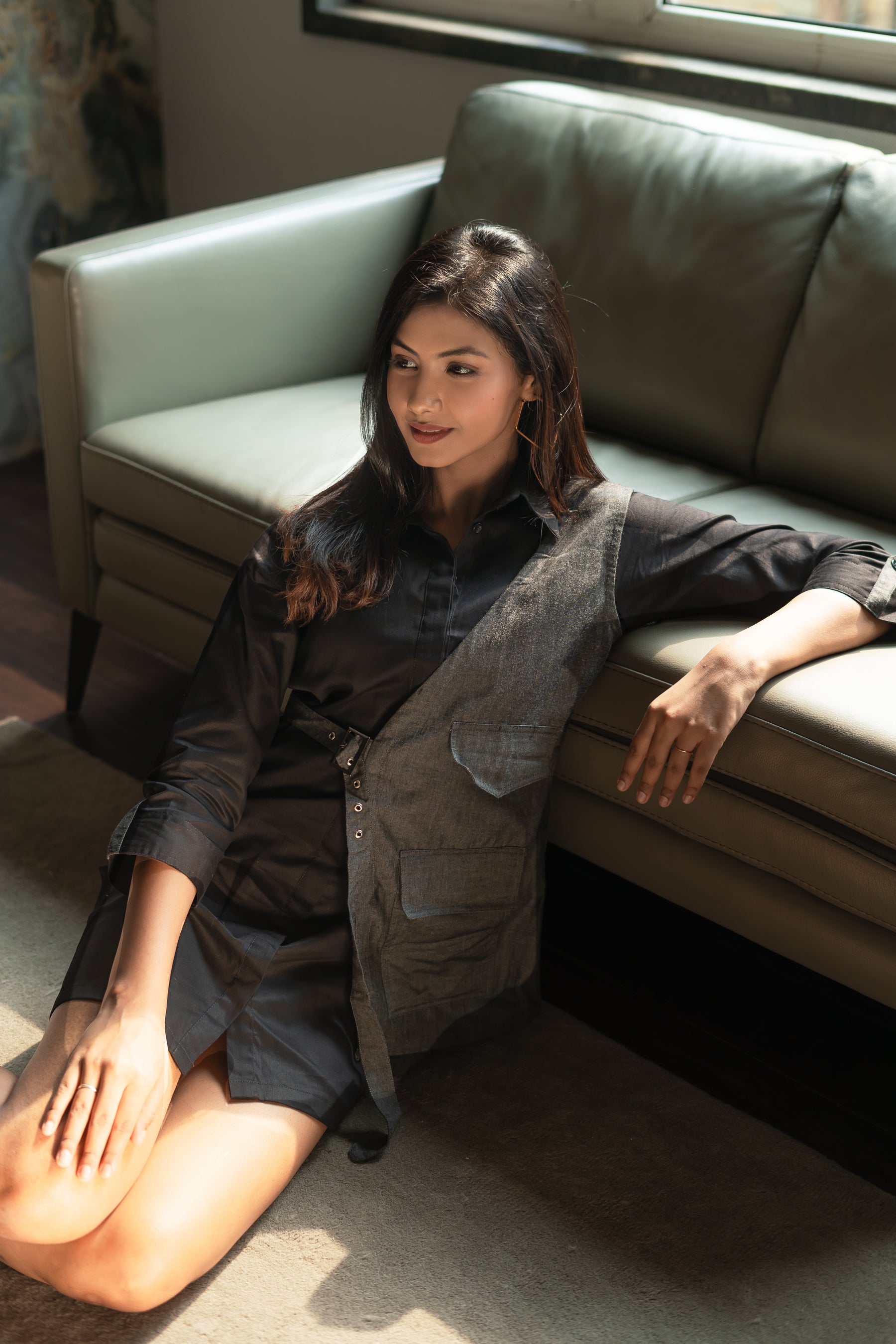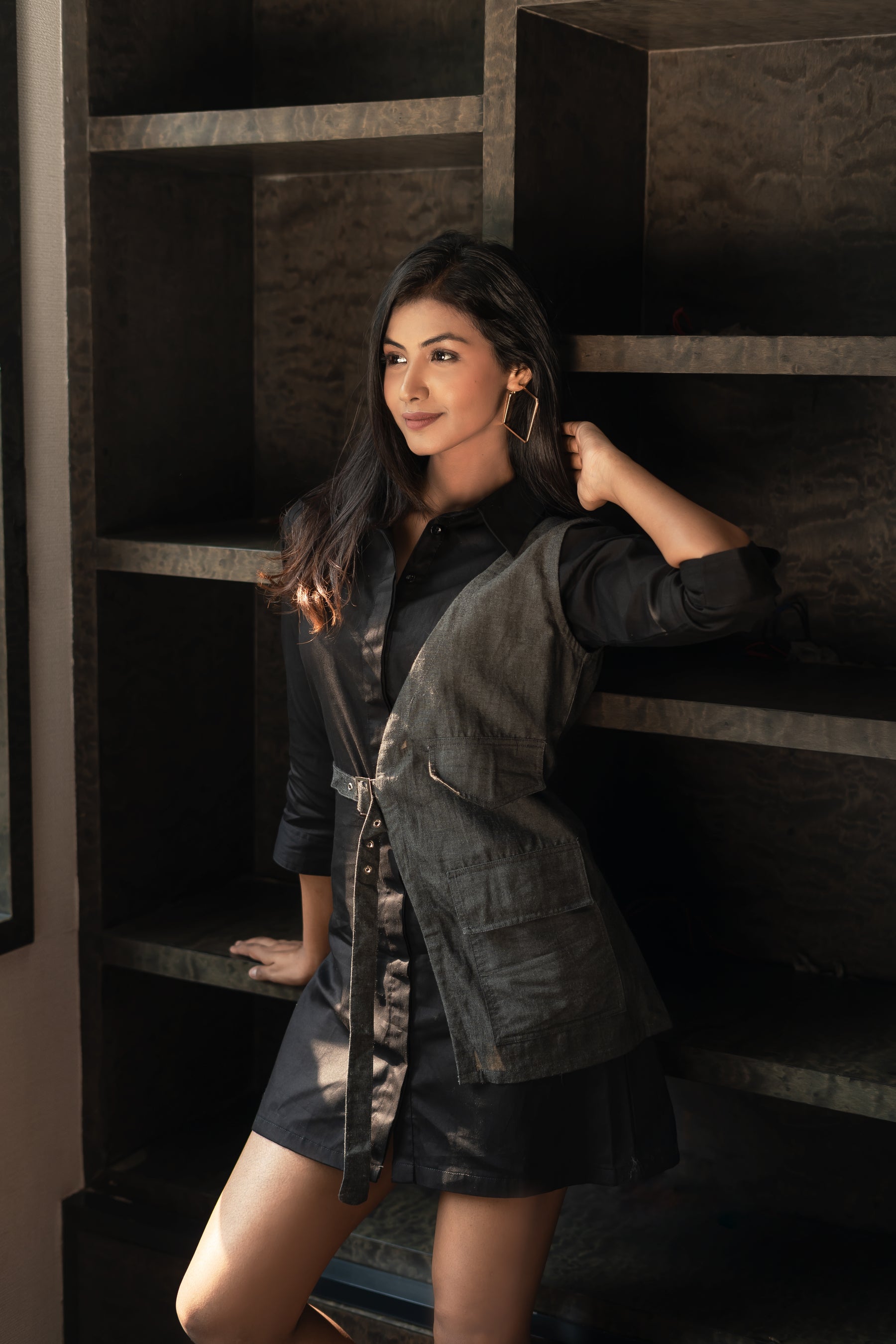 Our Black Collared Shirt Dress features a sleek, tailored silhouette with a versatile look. The overlay introduces an asymmetrical design detail, adding a contemporary twist. Ideal for both professional settings and chic outings, this statement piece seamlessly blends timeless style with modern design.